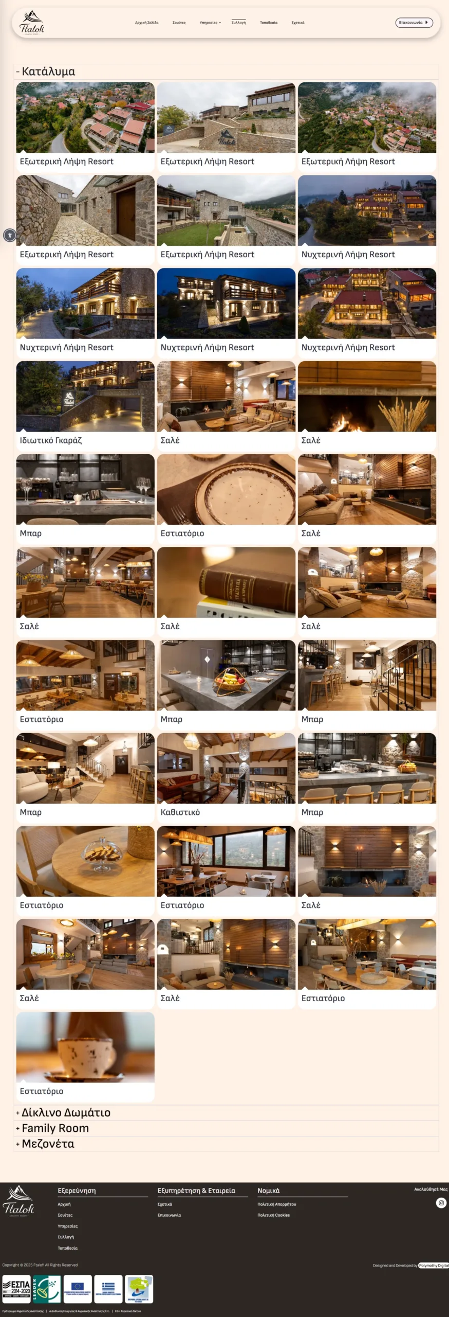 Το αποτέλεσμα είναι μια ζεστή, αυθεντική ψηφιακή παρουσία που αντικατοπτρίζει πιστά την ατμόσφαιρα του καταλύματος: χρωματική παλέτα και υφές που φέρνουν το χώρο στο ψηφιακό περιβάλλον, με συνεπή αισθητική σε κάθε σελίδα.